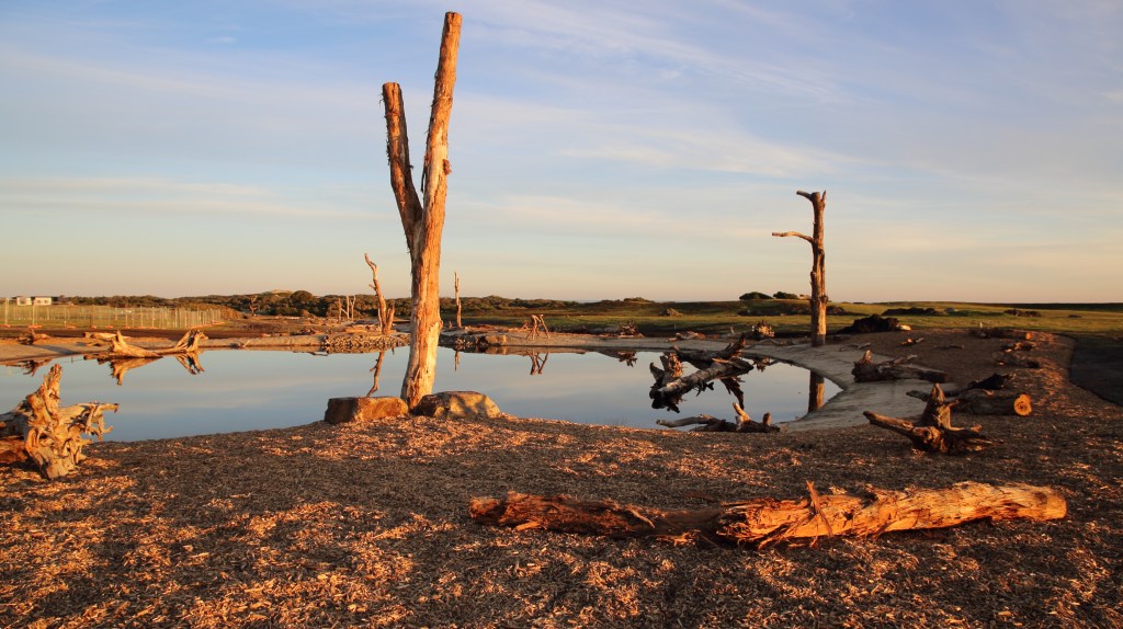 The habitat consists of a series of water bodies (dam, ponds, bogs and wetlands) which are interconnected by a rock stabilised creekline, both which have been enhanced with habitat structures such as microbat and bird habitat boxes, stags, logs, and rocks. A range of wetland vegetation species will be planted in late 2020 to border the creek along with indigenous shrub and tree plantings around the stags and nearby pocket parks. To follow the progress of the extensive re-vegetation project click on the tab Flora and Re-vegetation of The Cape in the Flora and Landscapes menu above.