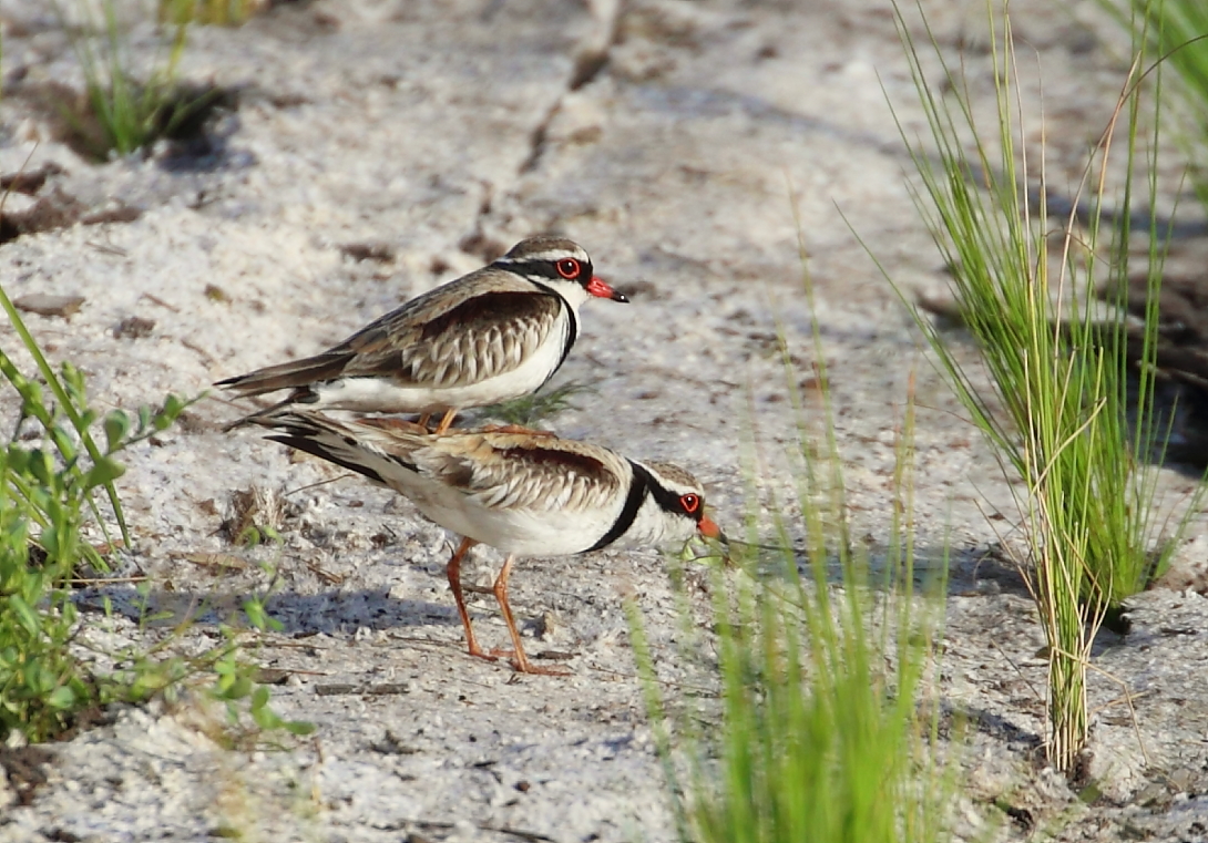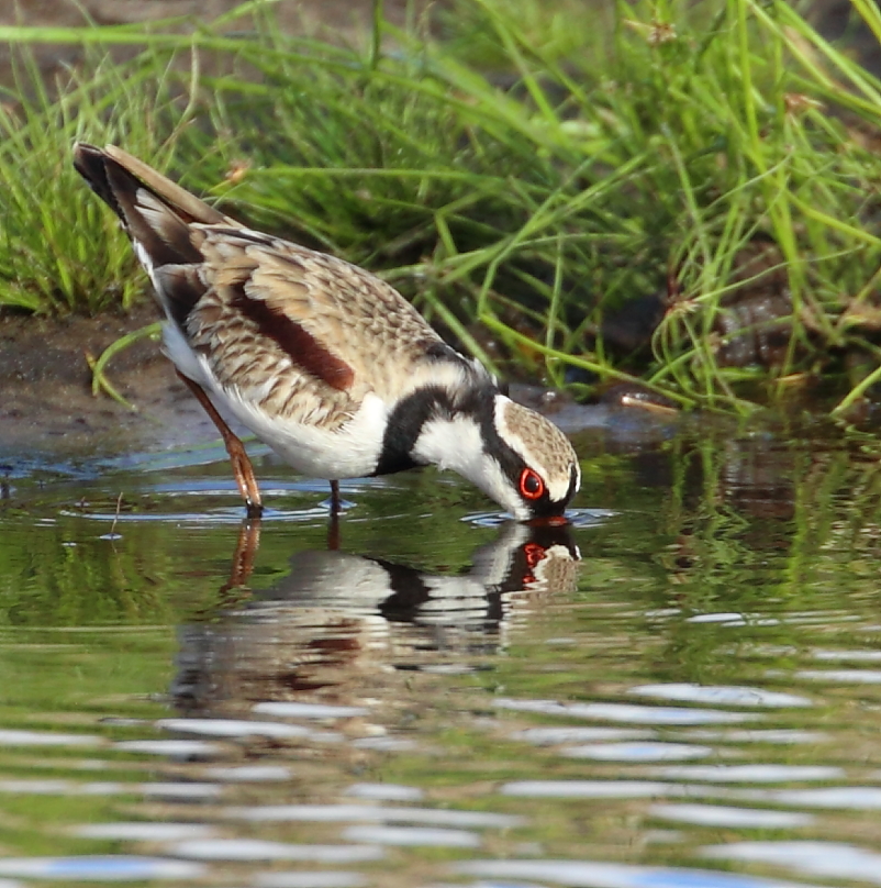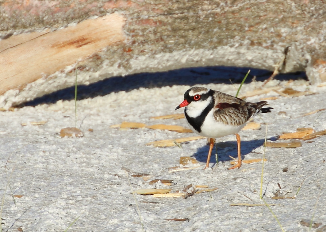 A small dainty bird that migrates from inland and appears in pairs around September at The Cape, primarily located in the wetlands and restored creek line where it works the fringes on mud and gravel as it avoids dense vegetation cover. From a distance, it is quite similar in appearance to the Hooded Plover on the beach – but it is slightly smaller, does not have the full black hood, has a maroon stripe on its wing and a distinctive black V on its chest. It will only wade in water a few millimetres deep. Nests are usually in small depressions on the ground near the water’s edge.