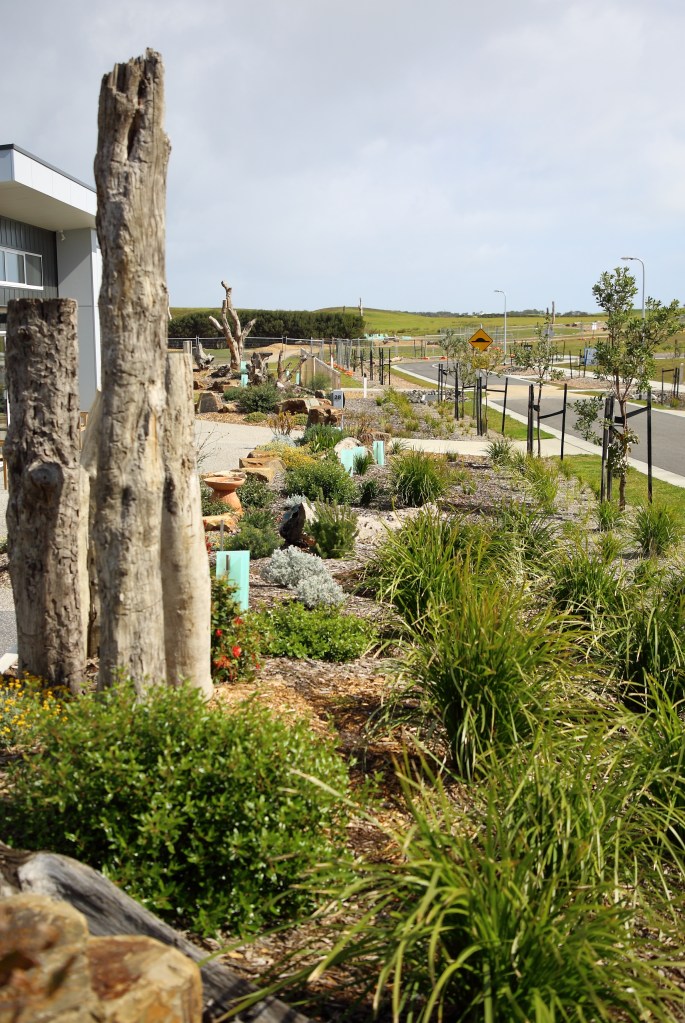 Streetscapes have been designed to reduce hard surface areas and to harvest water run-off from roads and footpaths. All street nature strips are landscaped with indigenous plant species (such as Coast Banksia and She Oak along with grasses, sedges and rushes) planted in swales, which not only provide vital habitat but also operate as water harvesting infrastructure for the creek line and wetland complexes.